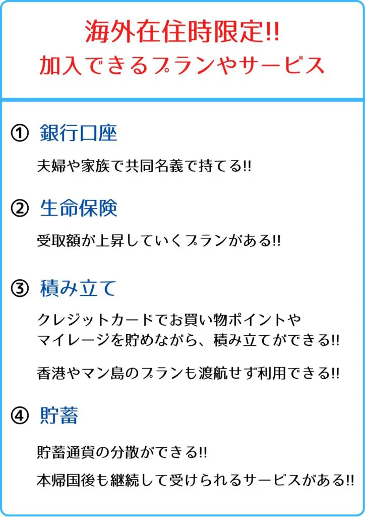 等々、海外在住中にしか受けれないサービスやプランがたくさんあります。
