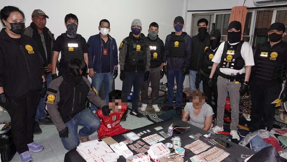 バンコク首都警察の麻薬取締部隊が、覚醒剤の出張注射サービスを行っていた男の部屋に踏み込み、現行犯逮捕した際の現場写真。