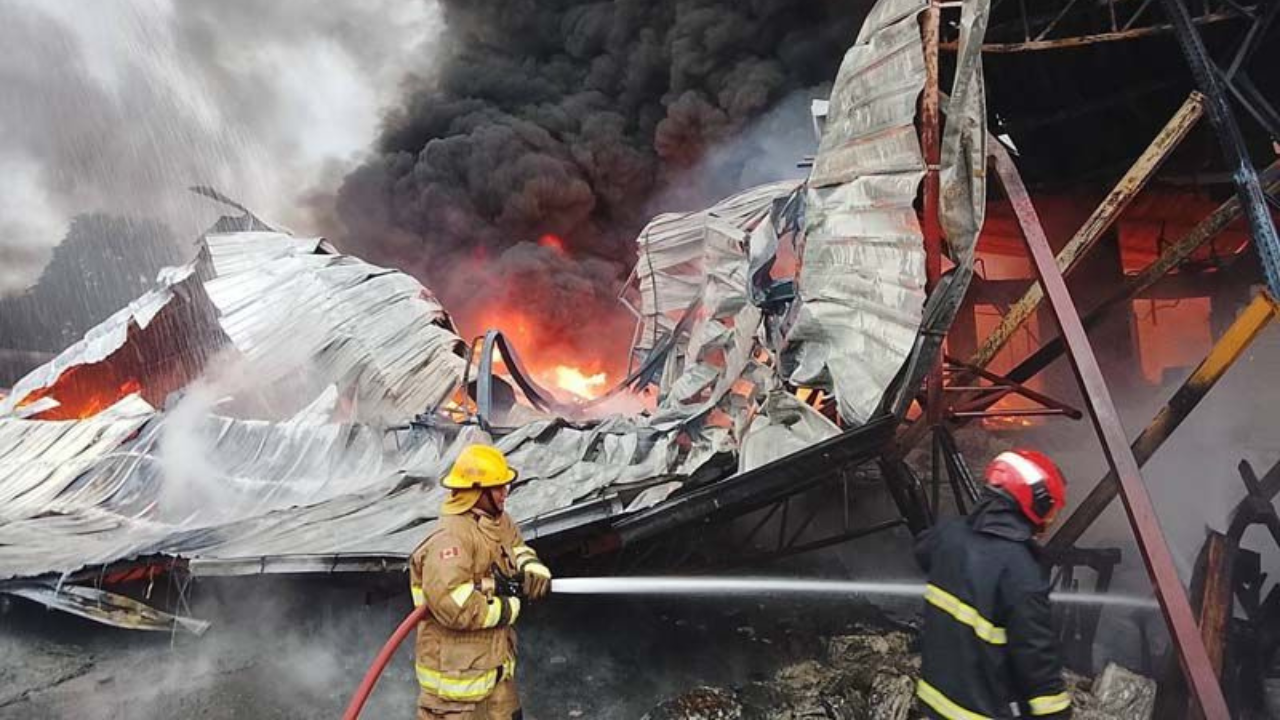タイ・シラチャで炎上する工場と消火活動を行う消防士