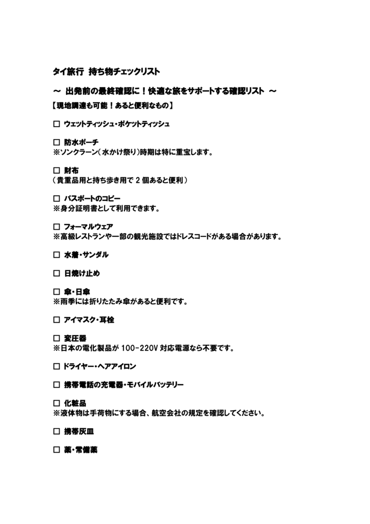 そんなタイの魅力とタイ旅行に行く際に、必要な物・準備したい物、そして現地調達でカバーできる物のリストをまとめてみました。初めてのタイ旅行や久しぶりのタイ旅行はだれでも緊張するものです。タイ旅行をエンジョイしてください。