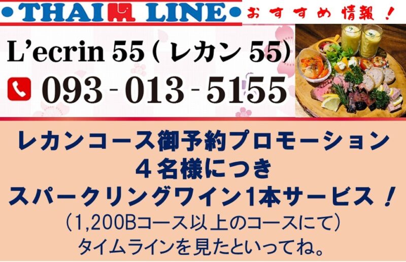 特典:5000バーツ(税抜き)以上のお食事をご利用の場合、次回使える1000バーツの割引券プレゼント