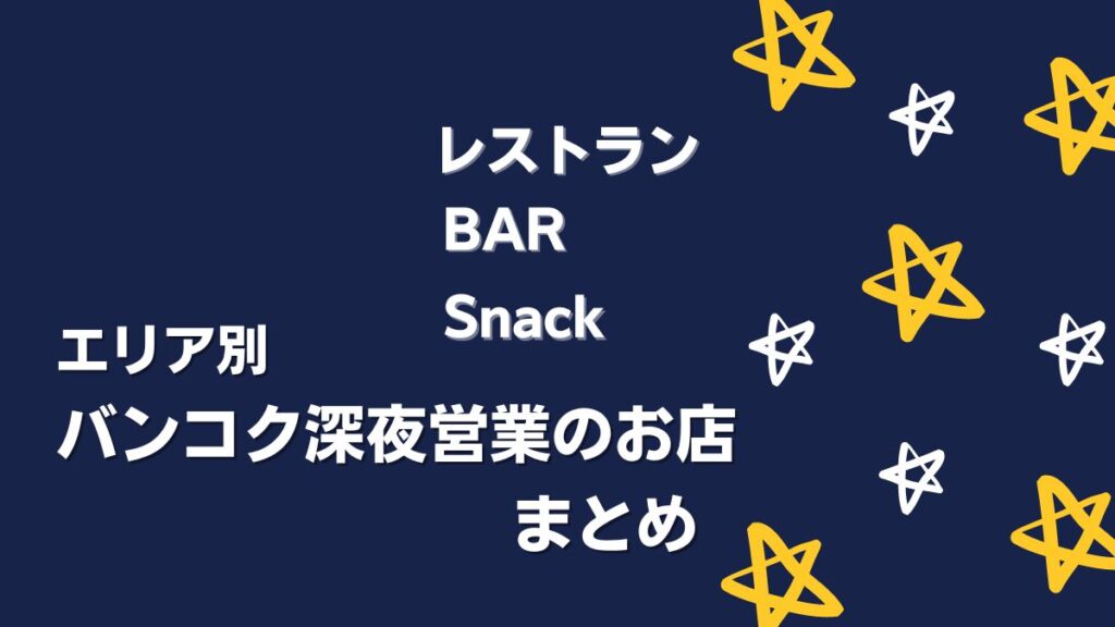 24時以降でも空いている飲食店やBARをまとめてご紹介。仕事が長引いたり、仲間との食事が、ついつい盛り上がりもう一軒!!そんな時に重宝するのが、バンコクで「深夜でも営業しているお店」や大事な人との「質の高い食事や手軽に飲めるお店」等を紹介します。「居酒屋・レストラン・専門店」だけでなく「BAR&スナック」等も紹介します。エリアや業種等からお店を見つける事が出来ますので夜中でも安心です。