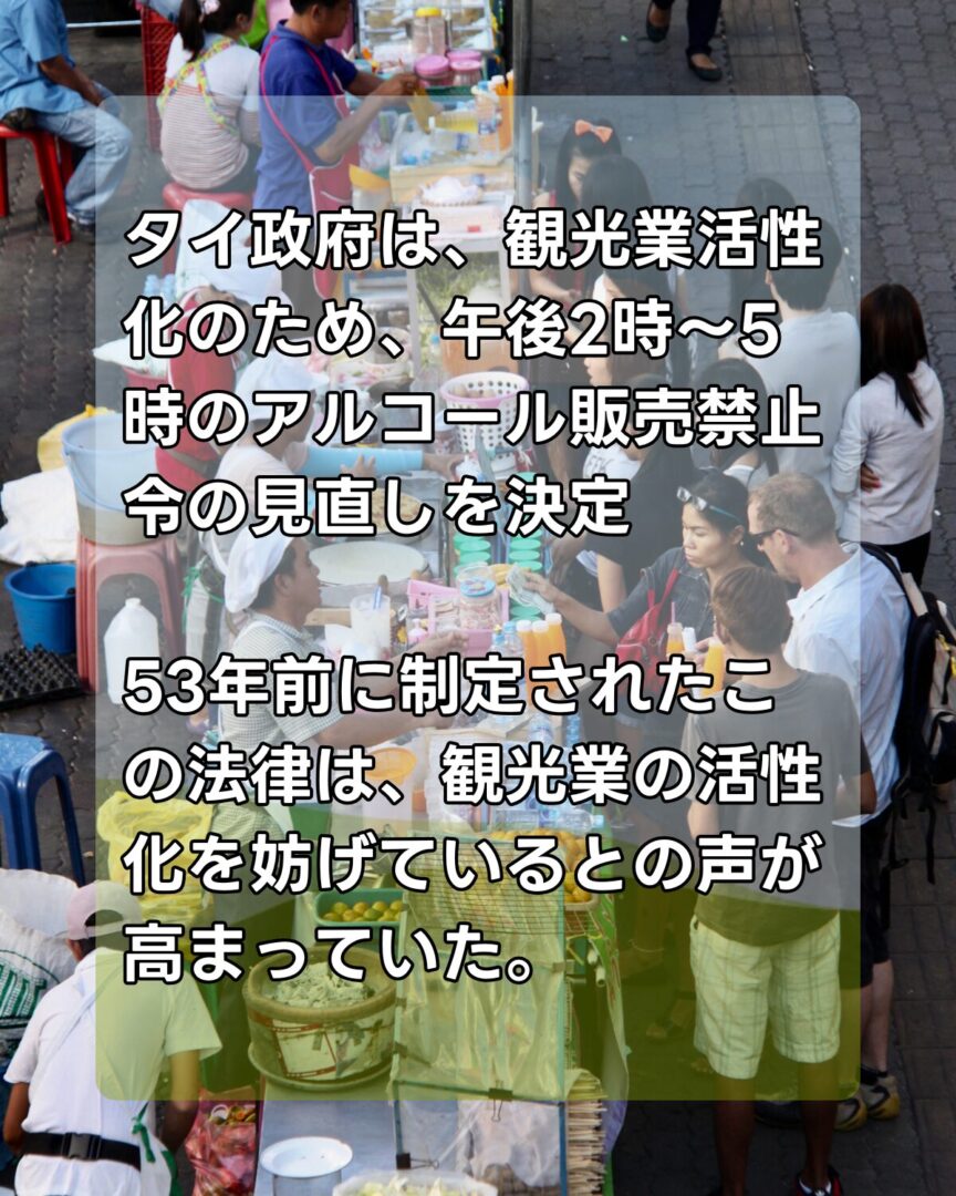 タイのペトンタン首相は、観光業活性化のため、午後2時~5時のアルコール販売禁止令の見直しを決定