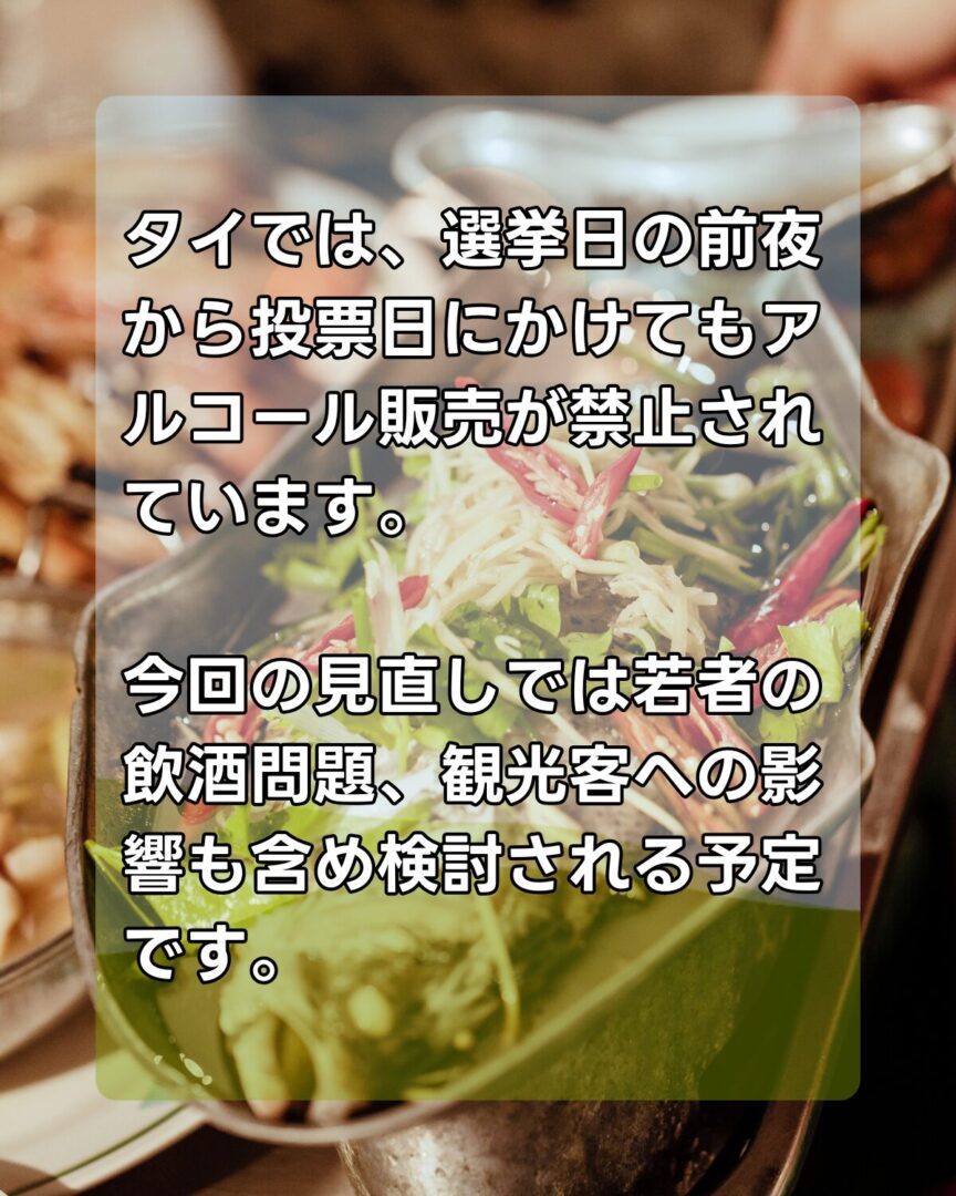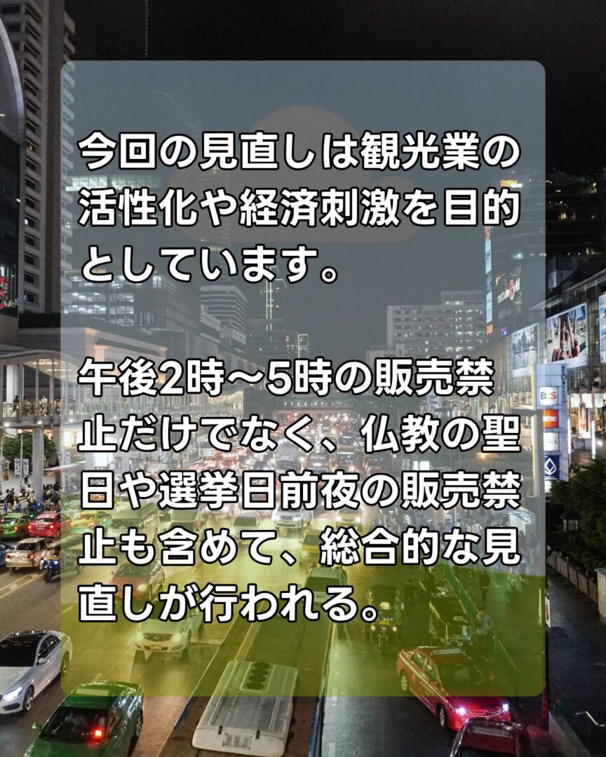 またそれに伴い午後2時~5時の販売禁止だけでなく、仏教の聖日や選挙日前夜の販売禁止(禁酒日)、COVID-19期間中の規制なども含めて、総合的な見直しが行われる。