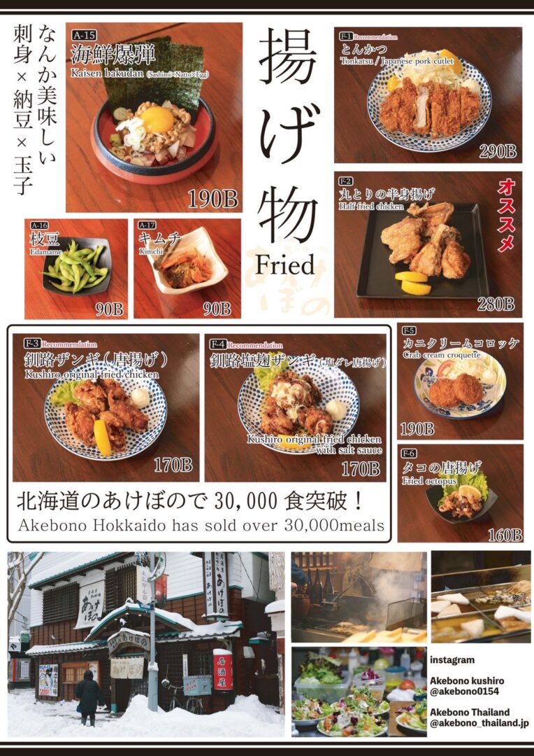 釧路は北海道有数の漁師町。新鮮なお刺身はもちろん炭火で魚介類を焼く炉端焼きが名物です。 あけぼのでは、北海道ならではの美味しい魚介と郷土料理を中心とした居酒屋メニューが安価に楽しめる特別なお店です。 一番のおすすめは、期間限定のおすすめも含めた焼き魚です。あなた好みの北海道グルメを見つけてご堪能ください。 釧路ザンギ(170B)もおすすめの逸品です。 トンローエリアの隠れ家的なエリアにあるゆったりと楽しめるお店です。