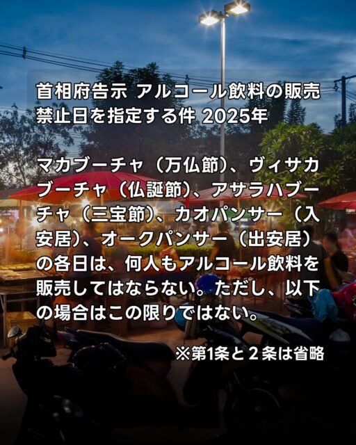 主要仏教祝日でも、国際空港、許可を得た一部の娯楽施設や観光地の飲食店、ホテル、大規模イベント会場では酒類が購入可能になりますが、一般的な小売店などでは引き続き販売が禁止されます。