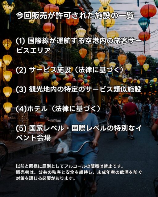 空港、ホテル、観光地の特定施設、国際イベント会場では販売が許可。