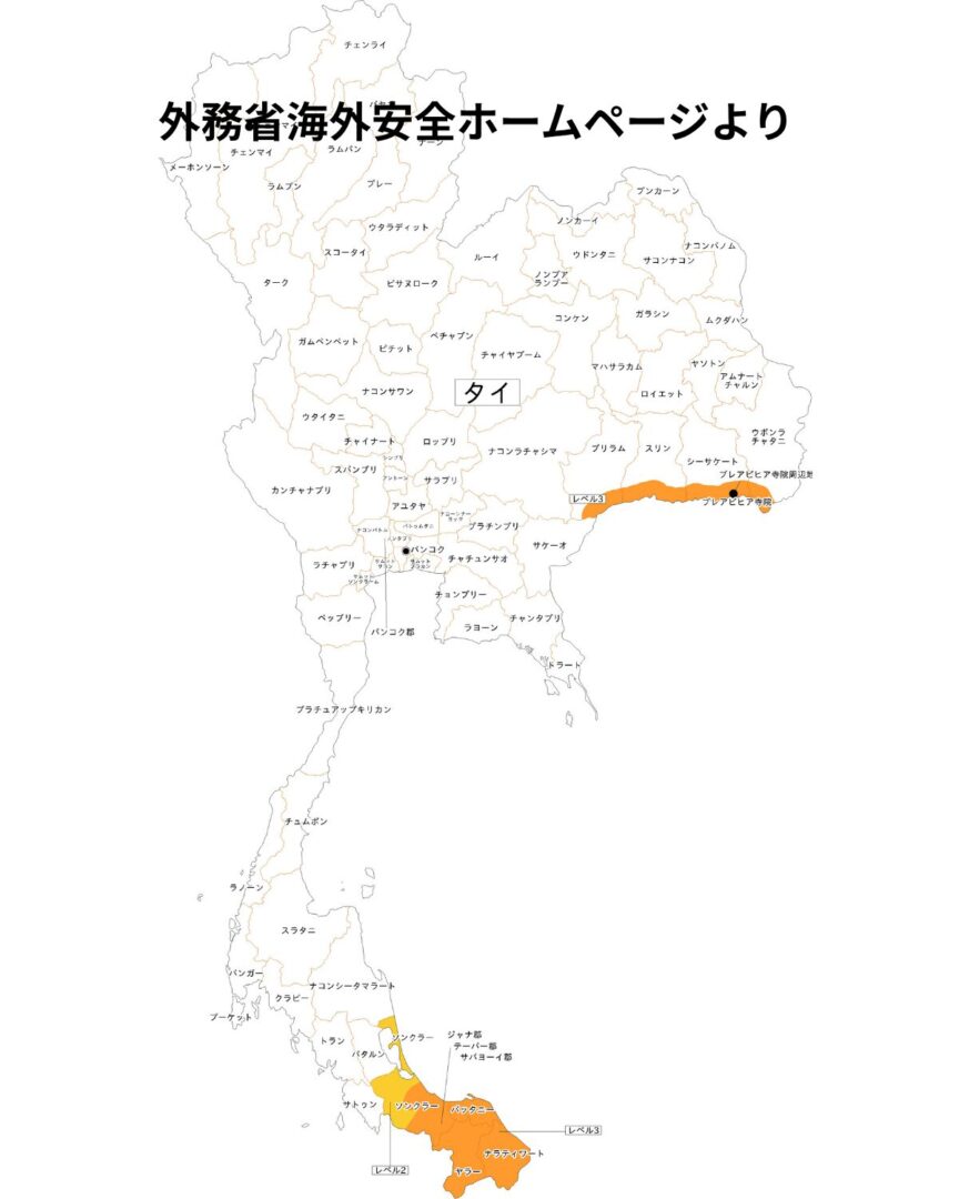 従来の渡航危険レベル3のエリアは南部3県と一部地域 ナラティワート県(Narathiwat) ヤラー県(Yala) パッタニー県(Pattani) これら3県とソンクラー県(Songkhla)の一部地域(ジャナ郡、テーパー郡、サバヨーイ郡)も同様にレベル3の対象となっています。
