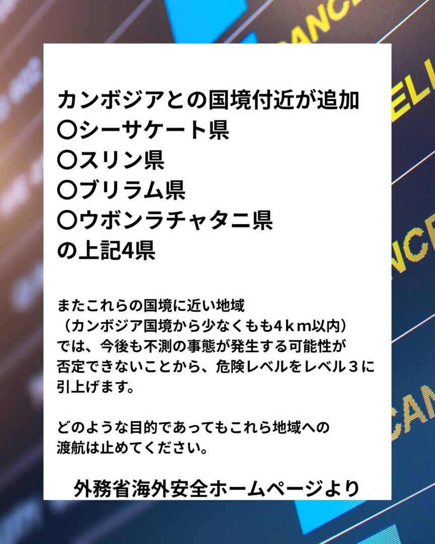 2 現在、シーサケート県、スリン県、ブリラム県、ウボンラチャタニ県のカンボジア国境から少なくとも40km以内については、日本政府による邦人向けの海外安全情報の危険レベルは3に引き上げられていますが、報道によれば、7月26日、トラート県の国境地帯でも両軍の衝突が発生した模様です。