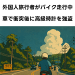 事件は、雨が降る中で発生しました。被害者のアメリカ人男性がバイクで走行中、後方から来た車に意図的に追突されました。転倒した被害者に対し、車から降りてきた覆面をした2人組の男がナイフを突きつけて脅し、腕時計を強奪して現場から逃走しました。