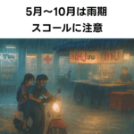 スコールが起こると前後は交通渋滞がひどくなるので、車やタクシーで移動する場合は大幅な予定変更になる事もしばしば。また傘はあまり売っていないので雨の中の移動を検討している場合は日本から折り畳み傘を持参したほうが良いですが、スコールだと折り畳み傘程度の雨対策は無意味になるかもしれません。別の方法でBTSやMRTでの移動を検討するのも良いでしょう。空が暗くなり出したら要注意です。この時期はほぼ100%雨が降ります。